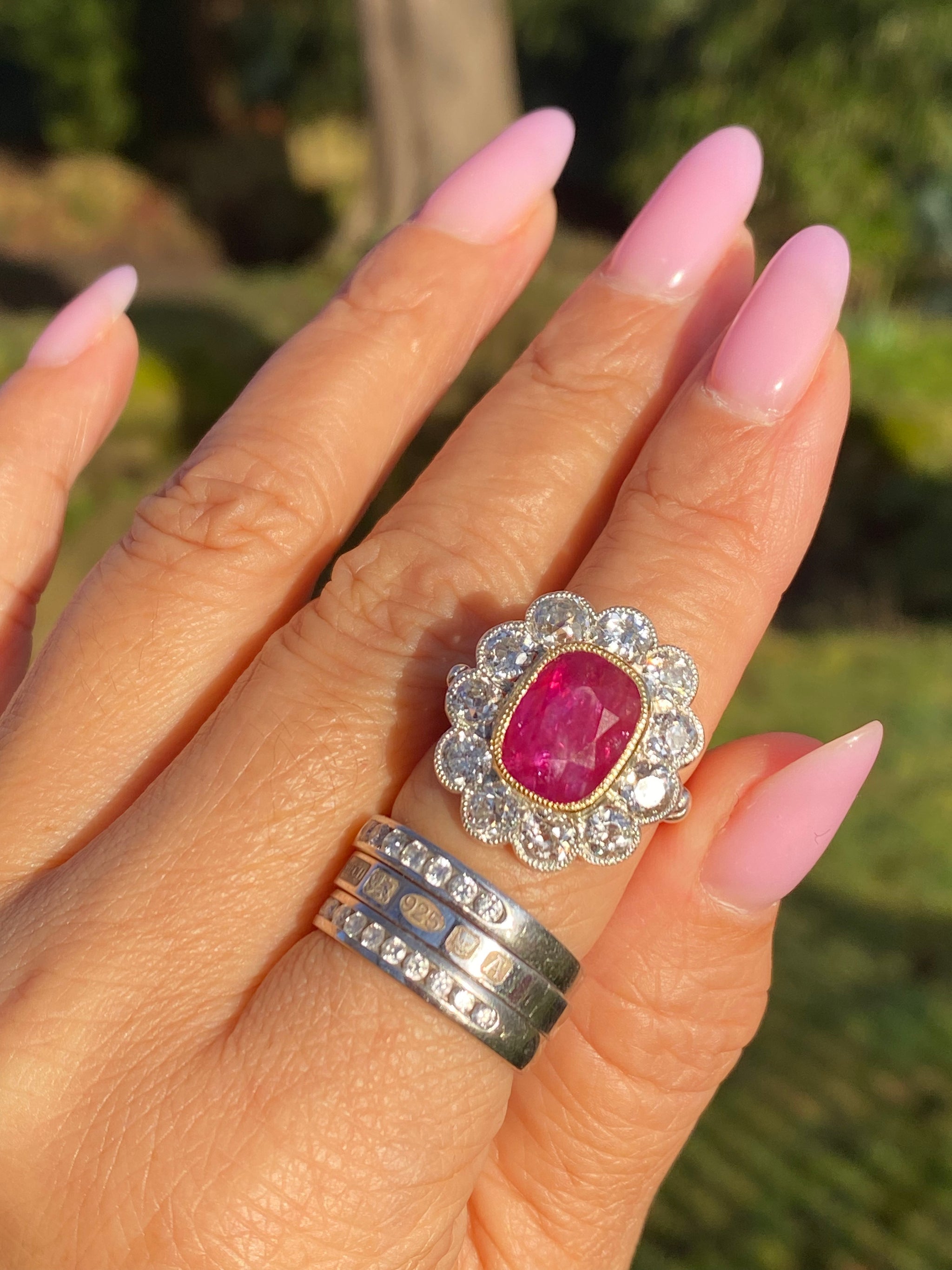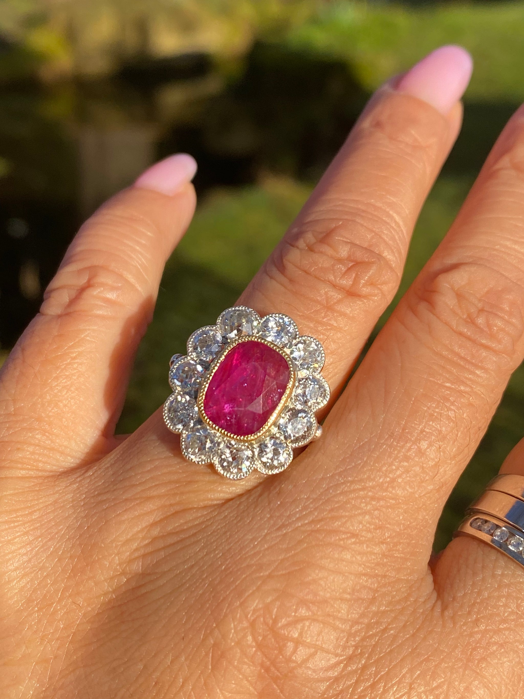 DESCRIPTION A truly exceptional Edwardian era antique ring, dating to circa 1900, showcasing a magnificent natural Burmese ruby of outstanding size and rarity, surrounded by a halo of antique-cut diamonds....
