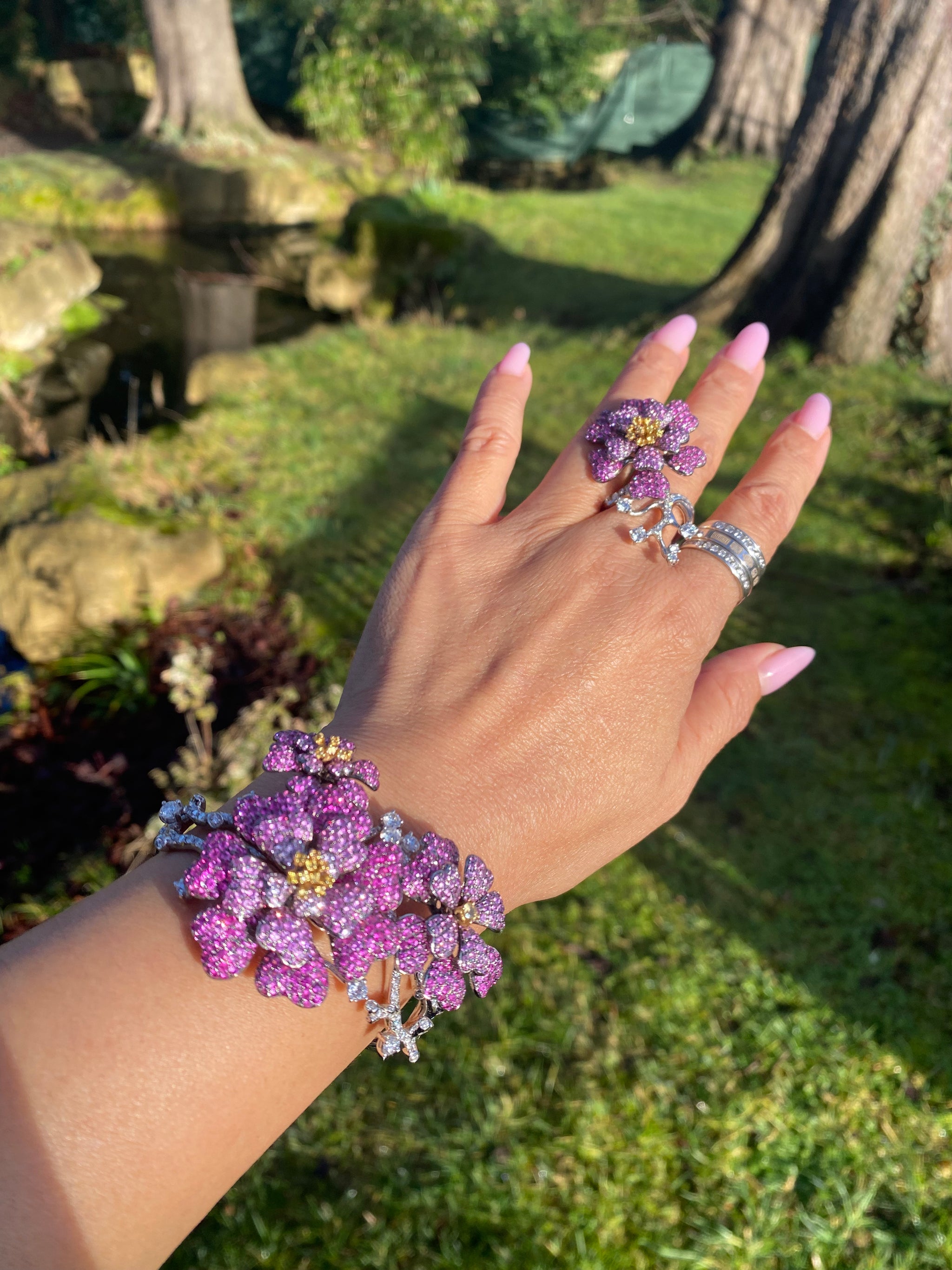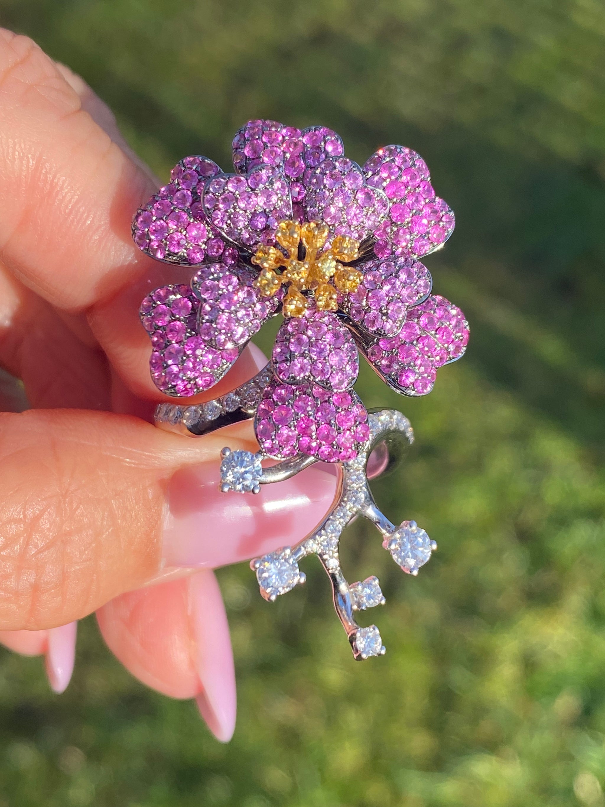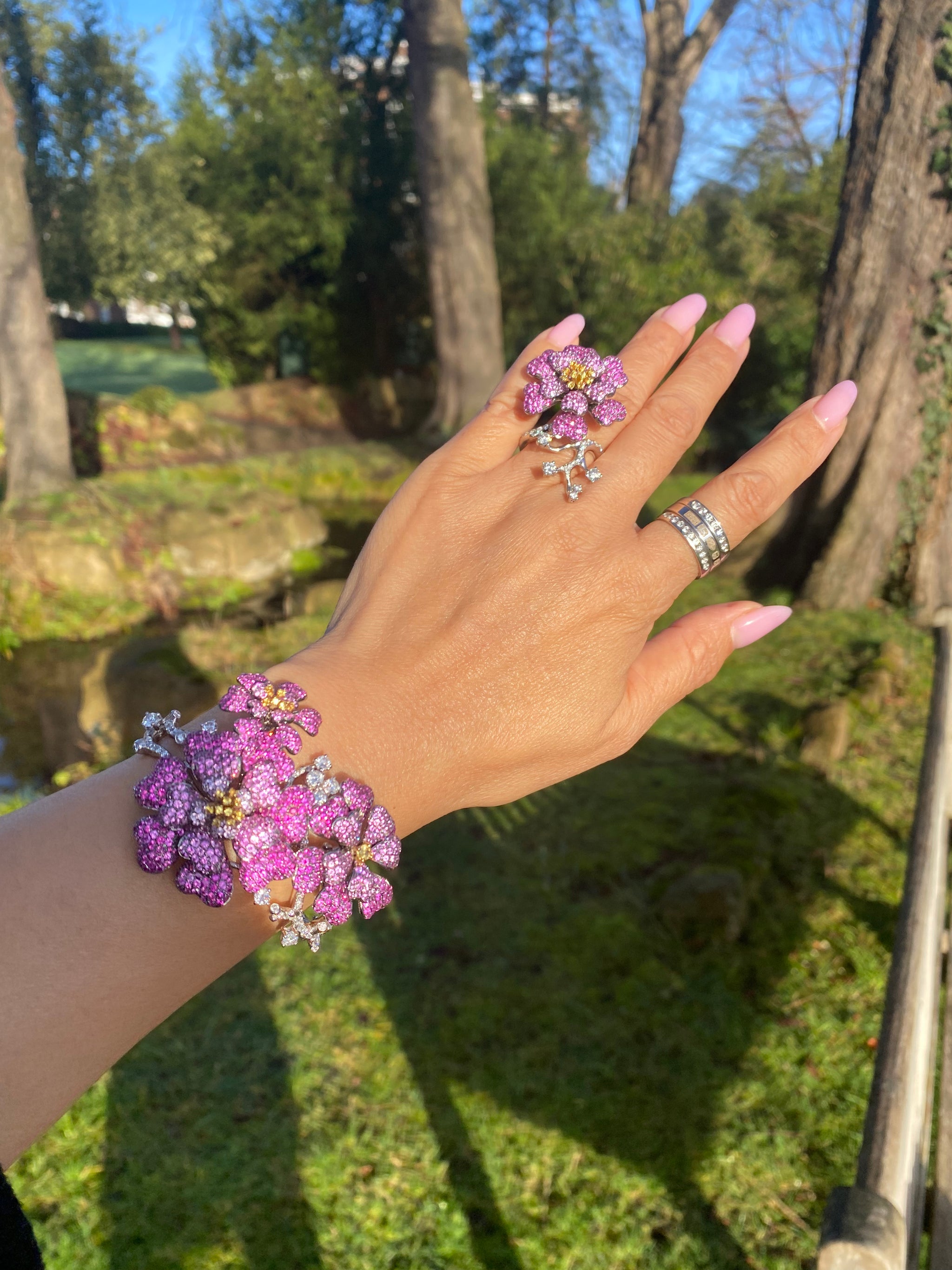 18K White Gold Pink & Yellow Sapphire Diamond Ring & Bracelet Set | WGI Certified Luxury Floral Jewelry Set