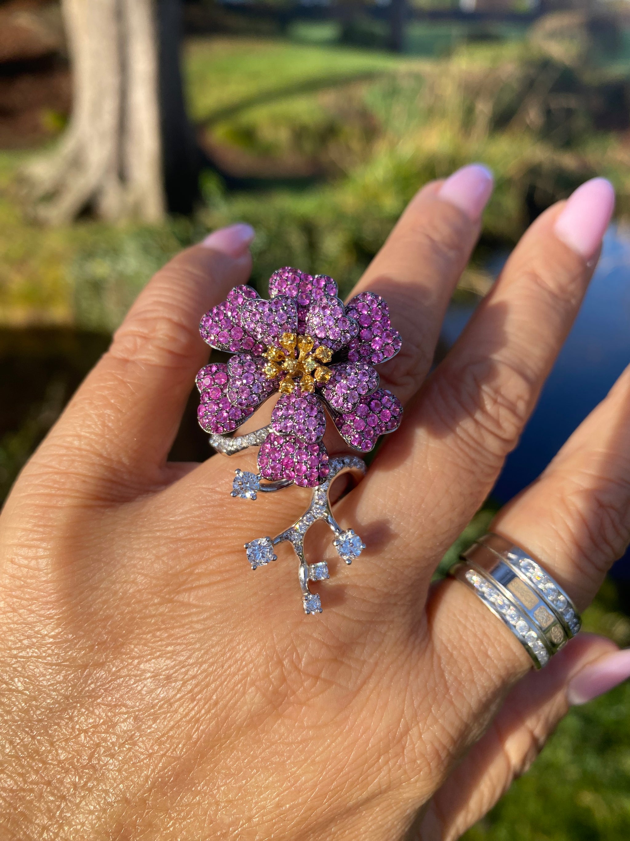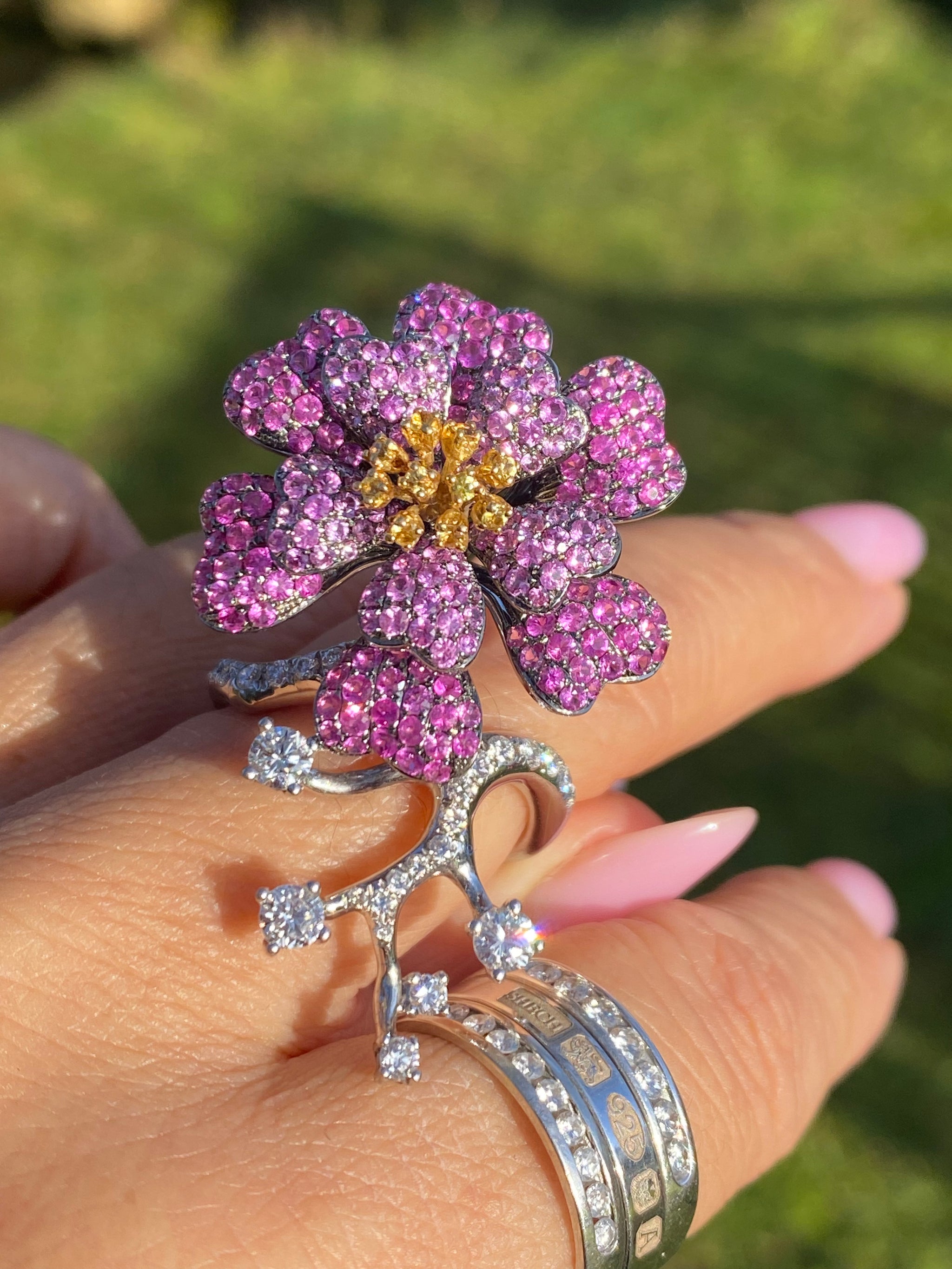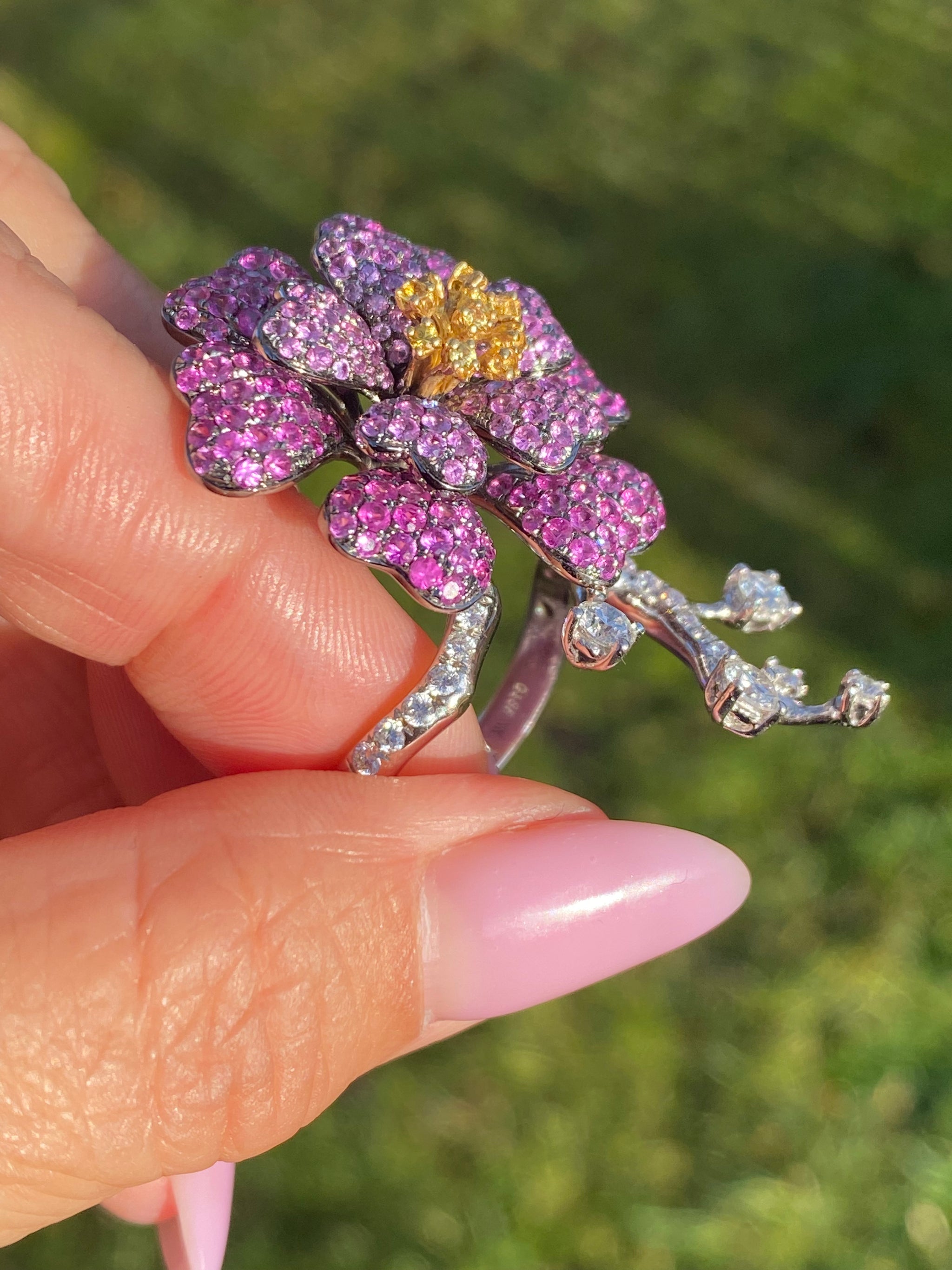 18K White Gold Pink & Yellow Sapphire Diamond Ring & Bracelet Set | WGI Certified Luxury Floral Jewelry Set