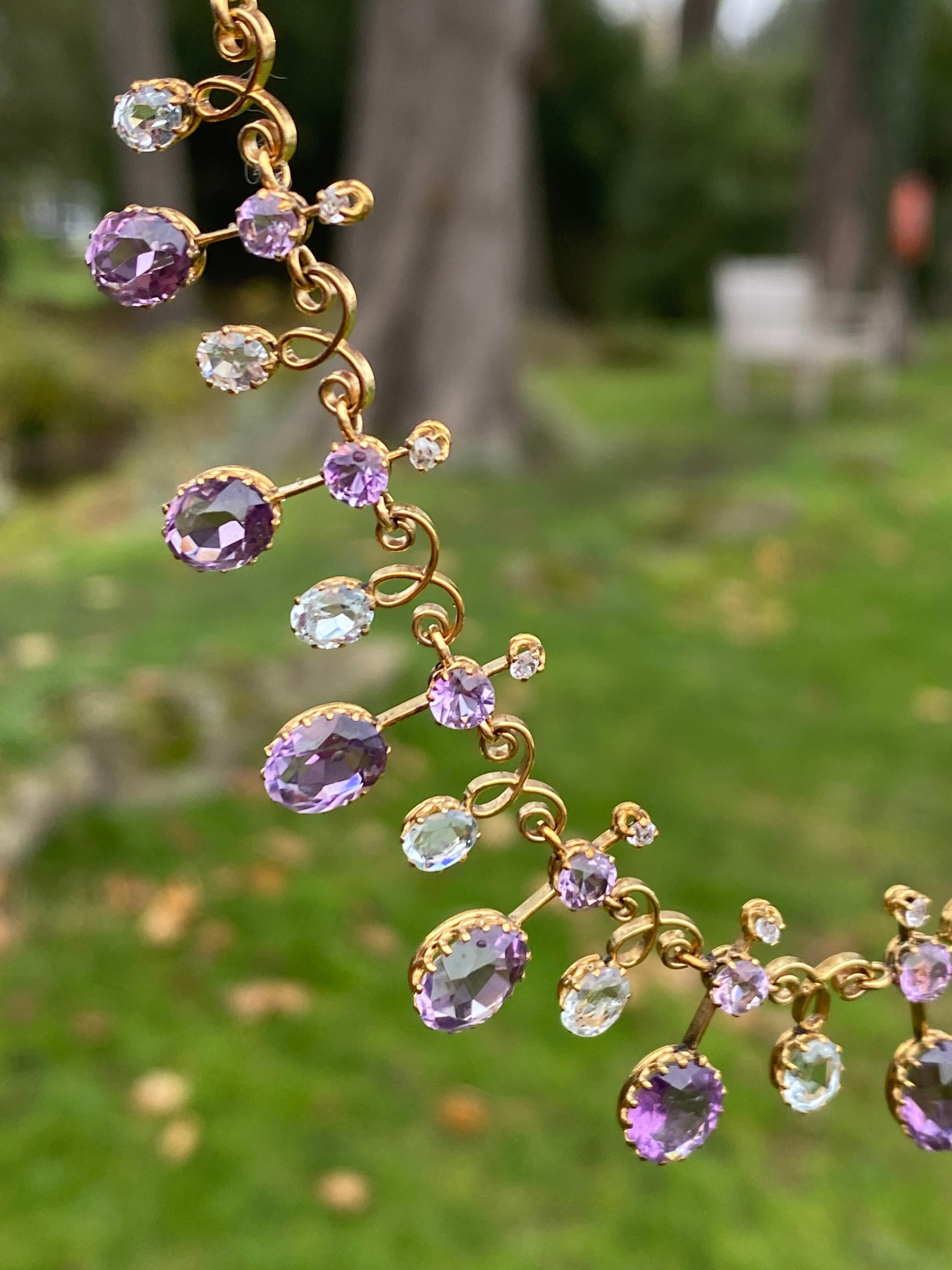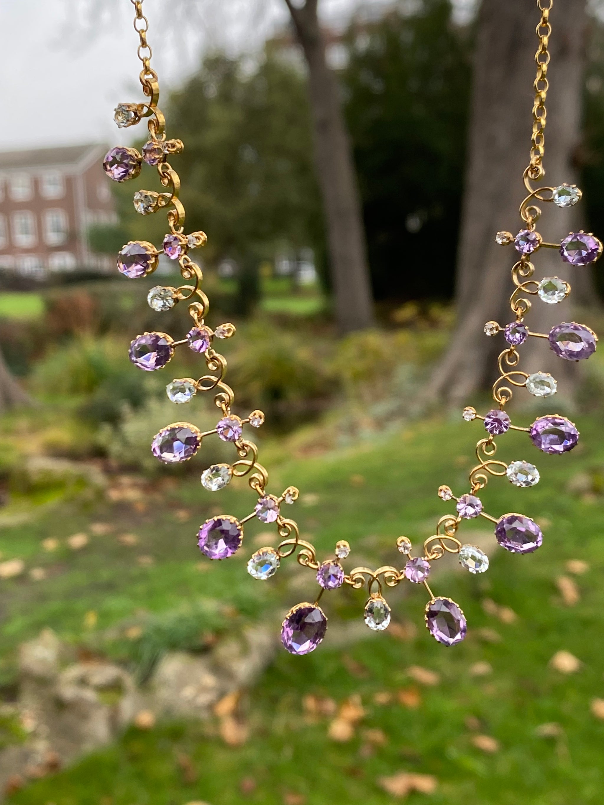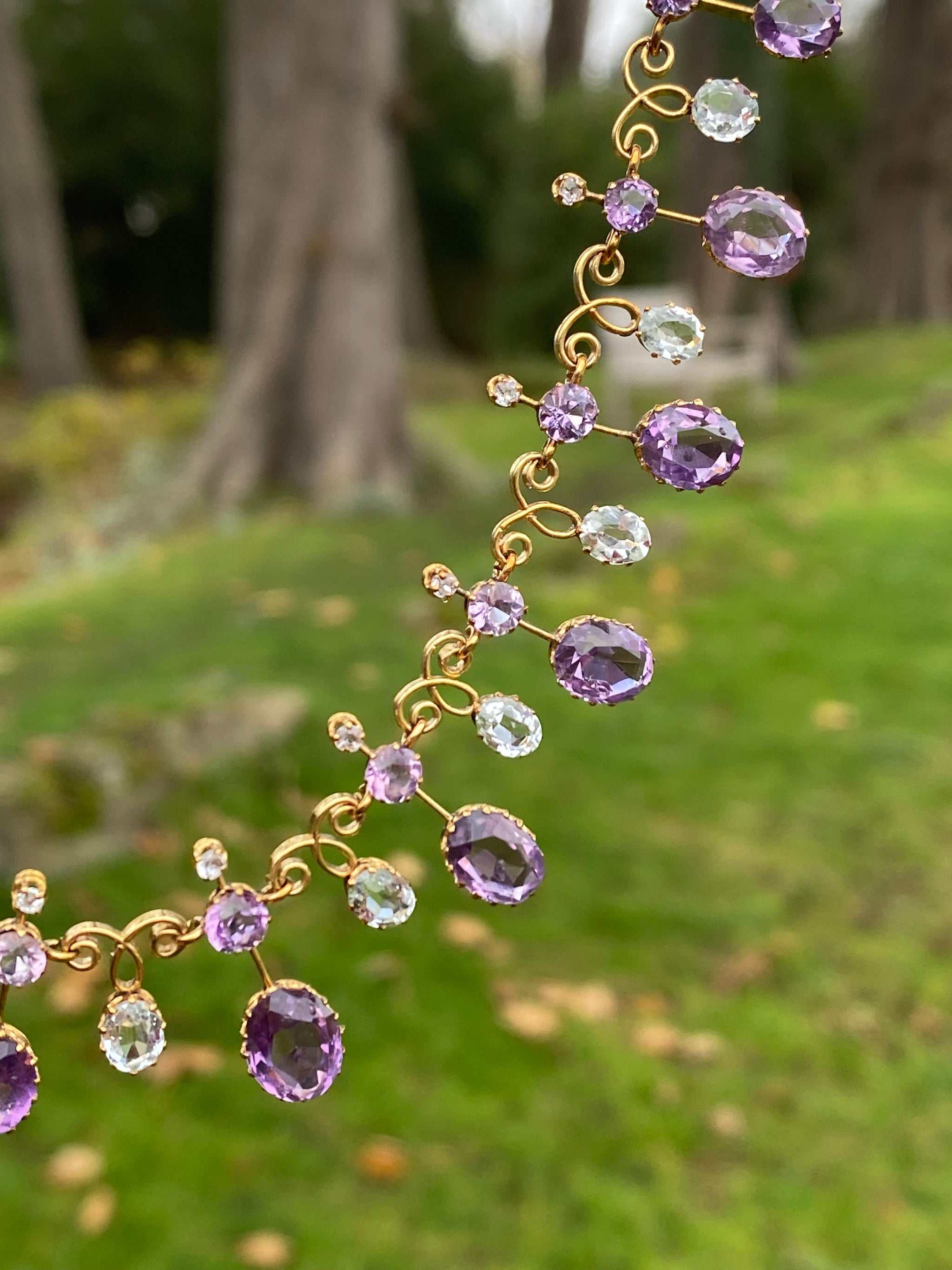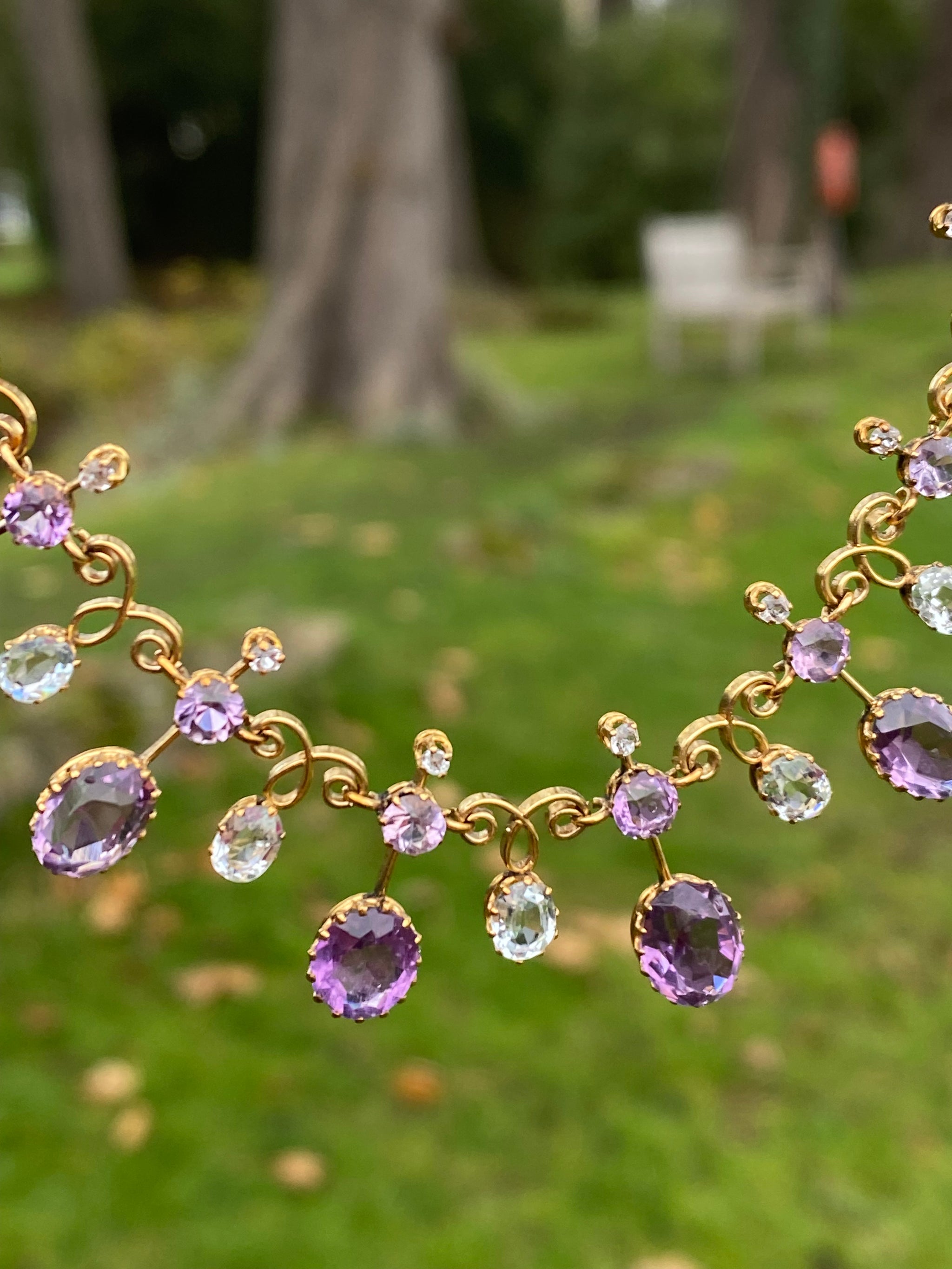SOLD OUT REFERENCE: 67-0952 SUBJECT c.1890s Harlequin Necklace | Antique Amethyst & Aquamarine | 18K Gold | French Eagle Head Hallmark DESCRIPTION An exquisite antique Harlequin-style necklace, dating to the...