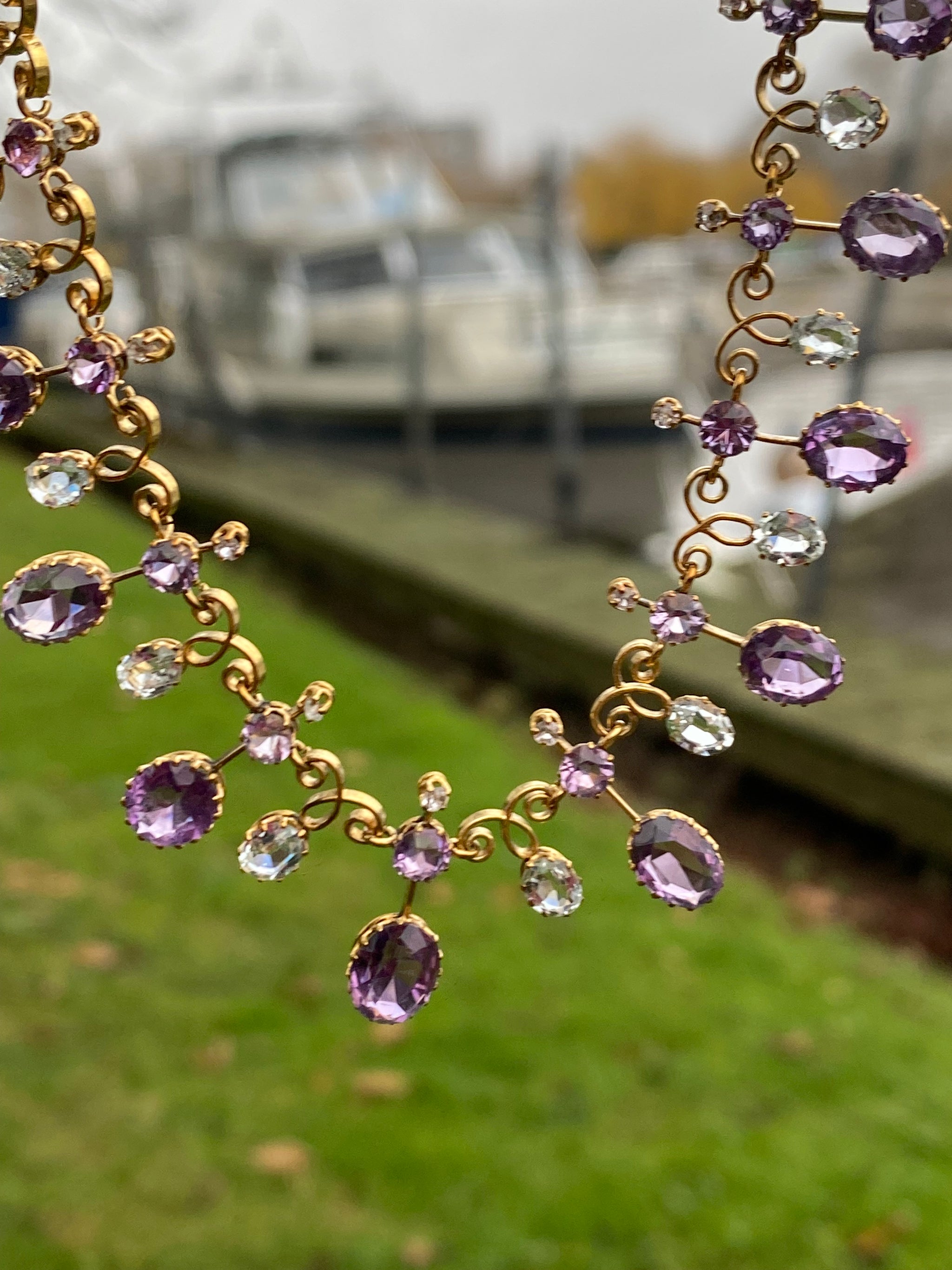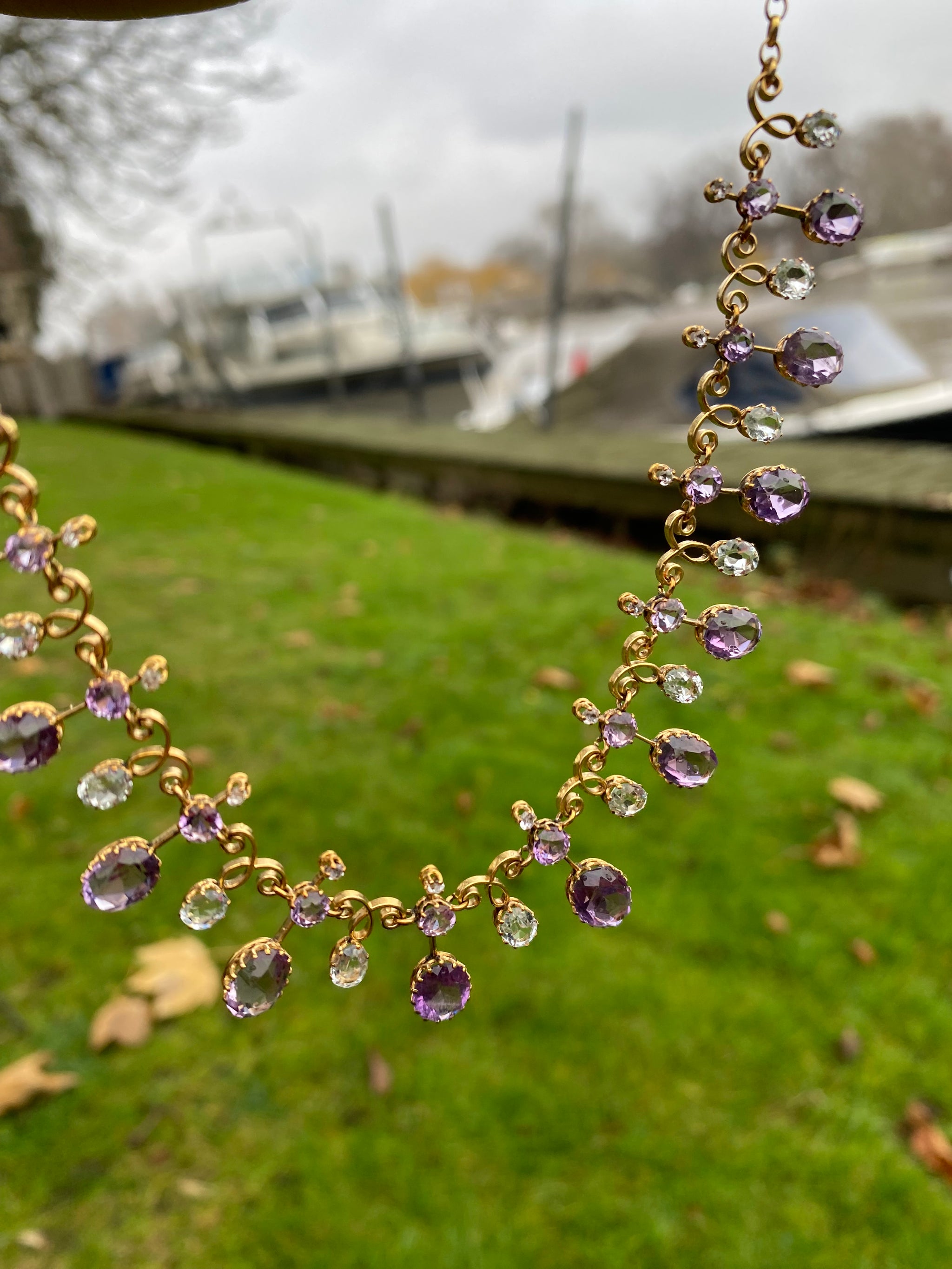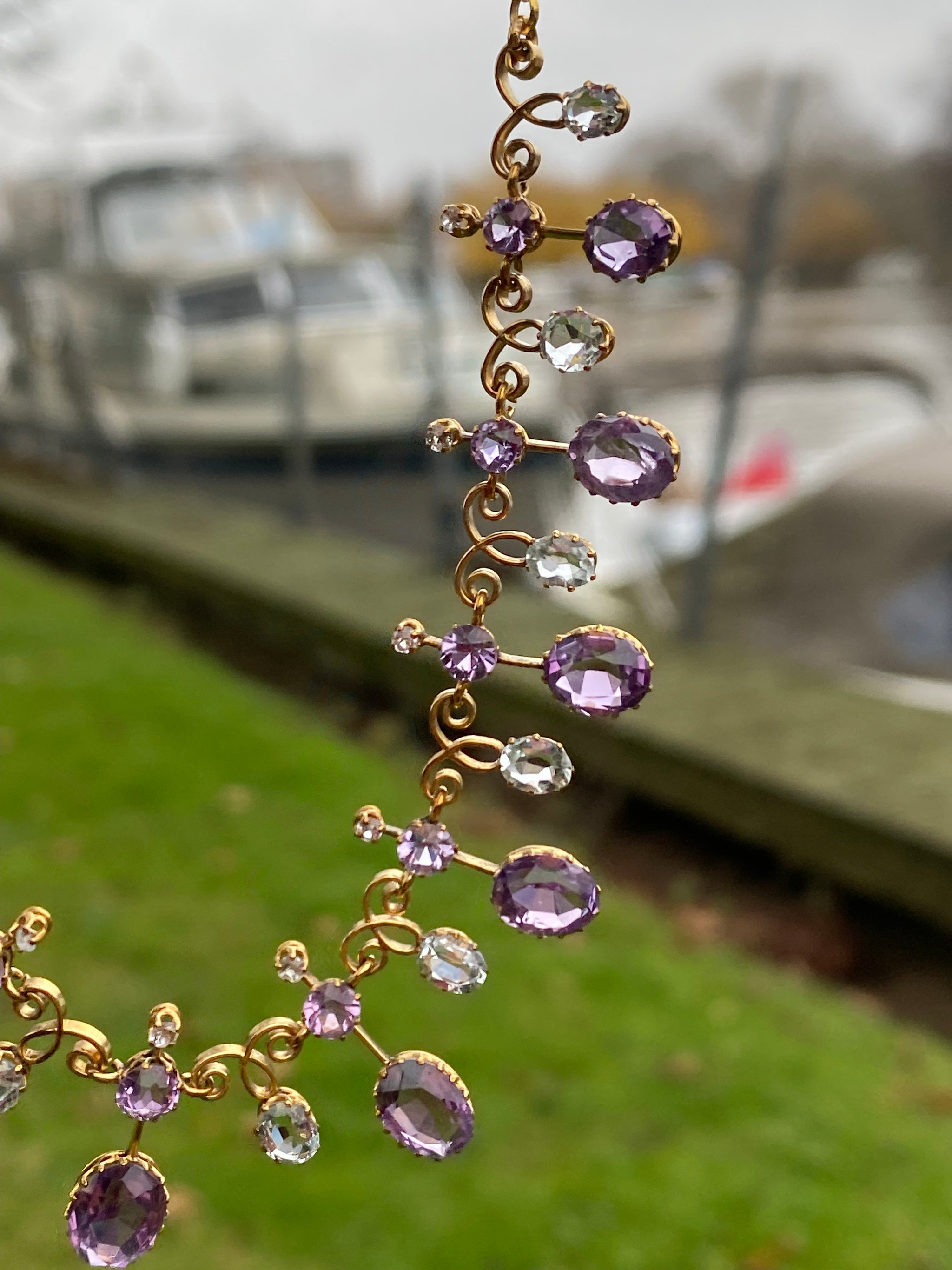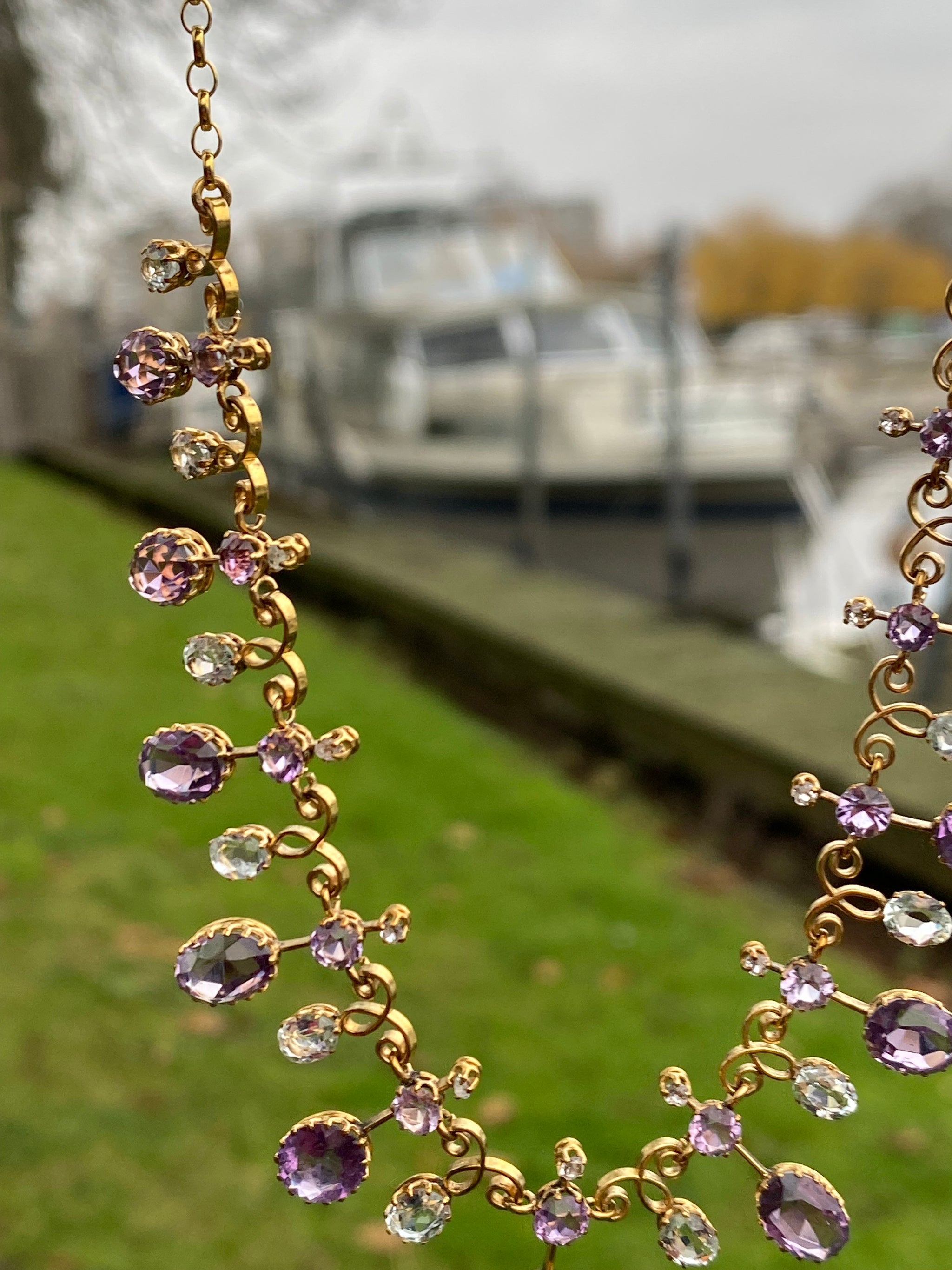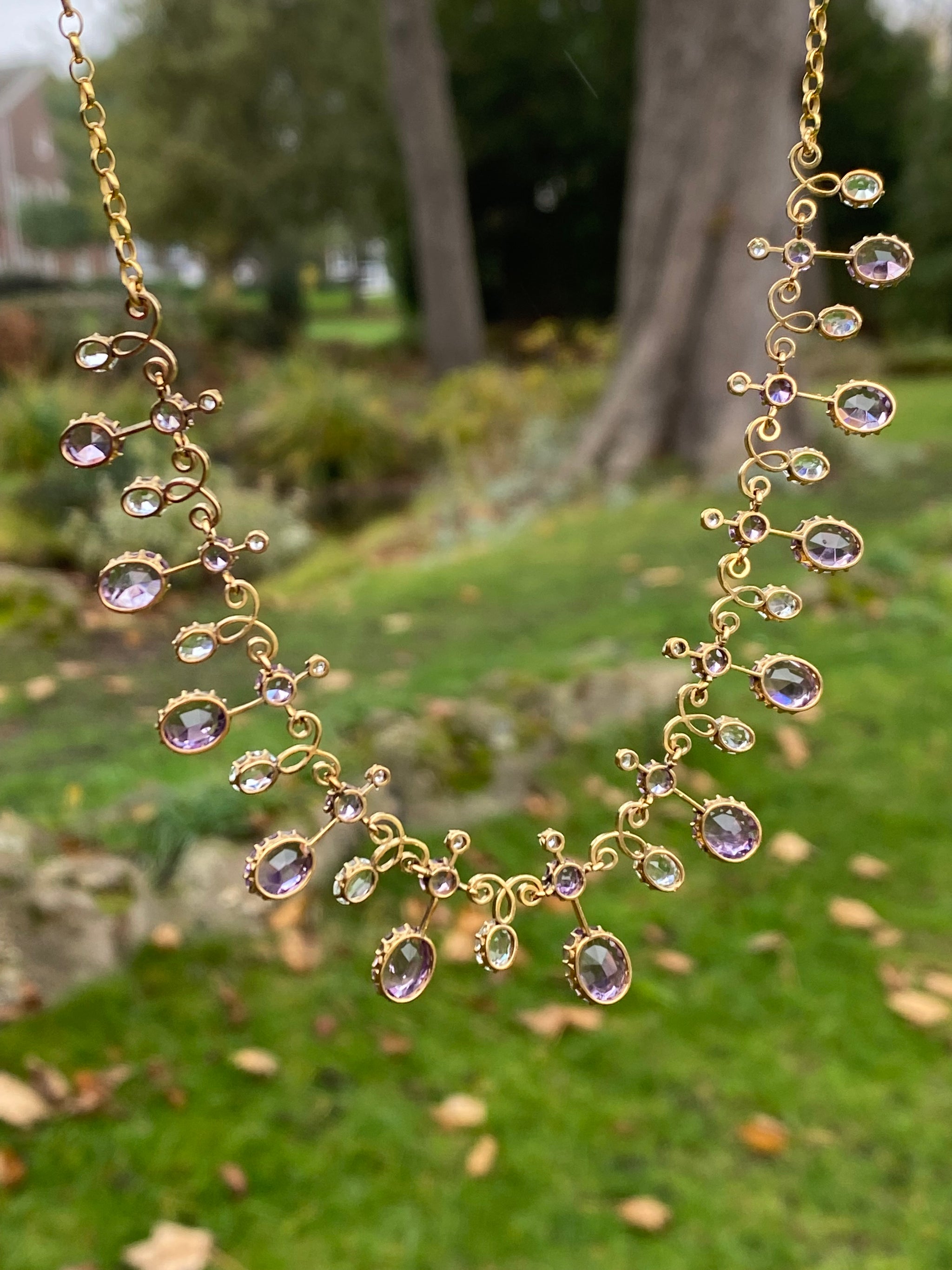 SOLD OUT REFERENCE: 67-0952 SUBJECT c.1890s Harlequin Necklace | Antique Amethyst & Aquamarine | 18K Gold | French Eagle Head Hallmark DESCRIPTION An exquisite antique Harlequin-style necklace, dating to the...
